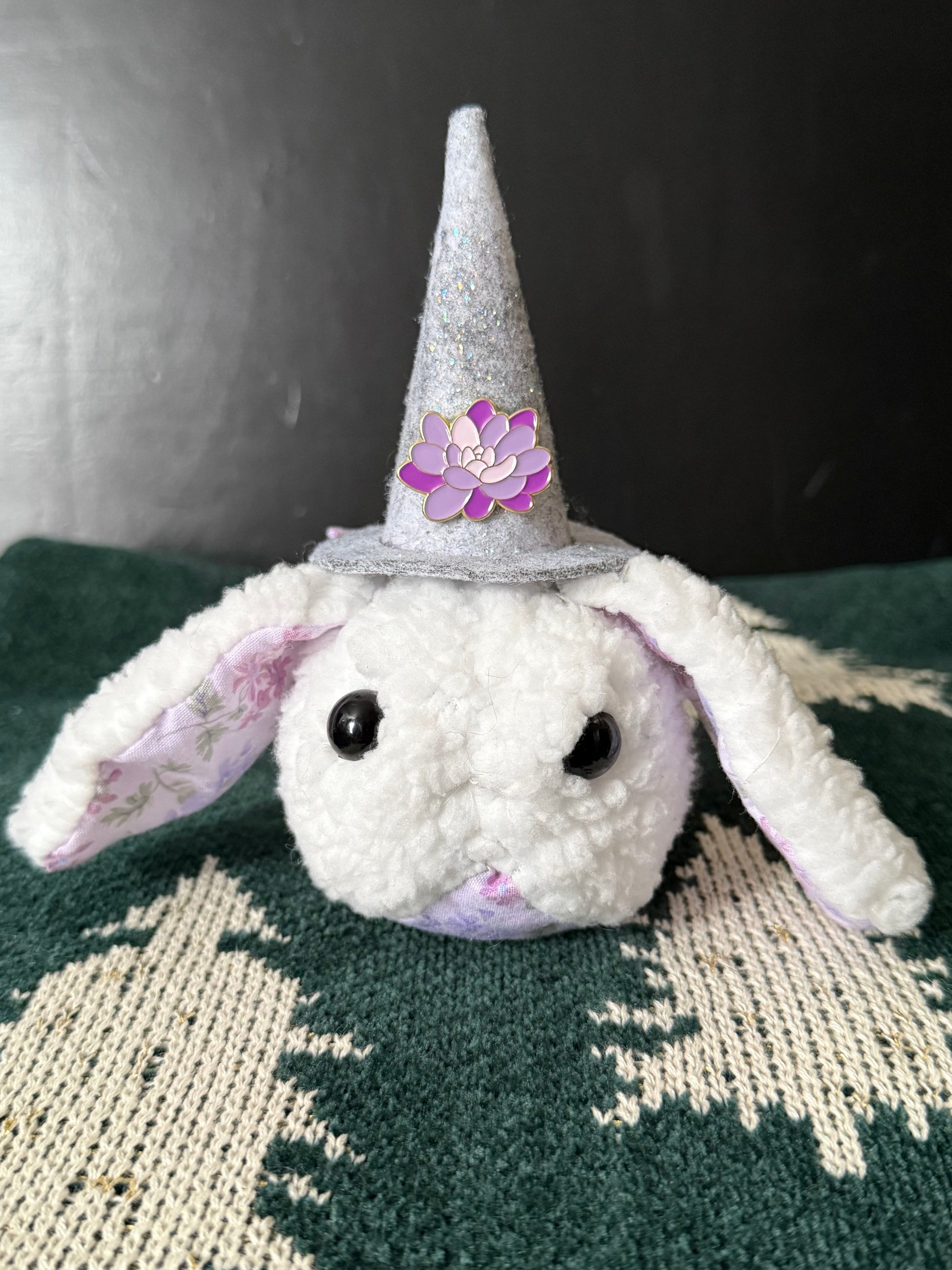- Comes with a randomized glitter witches hat, matching pin, and emotional support bun sprite.